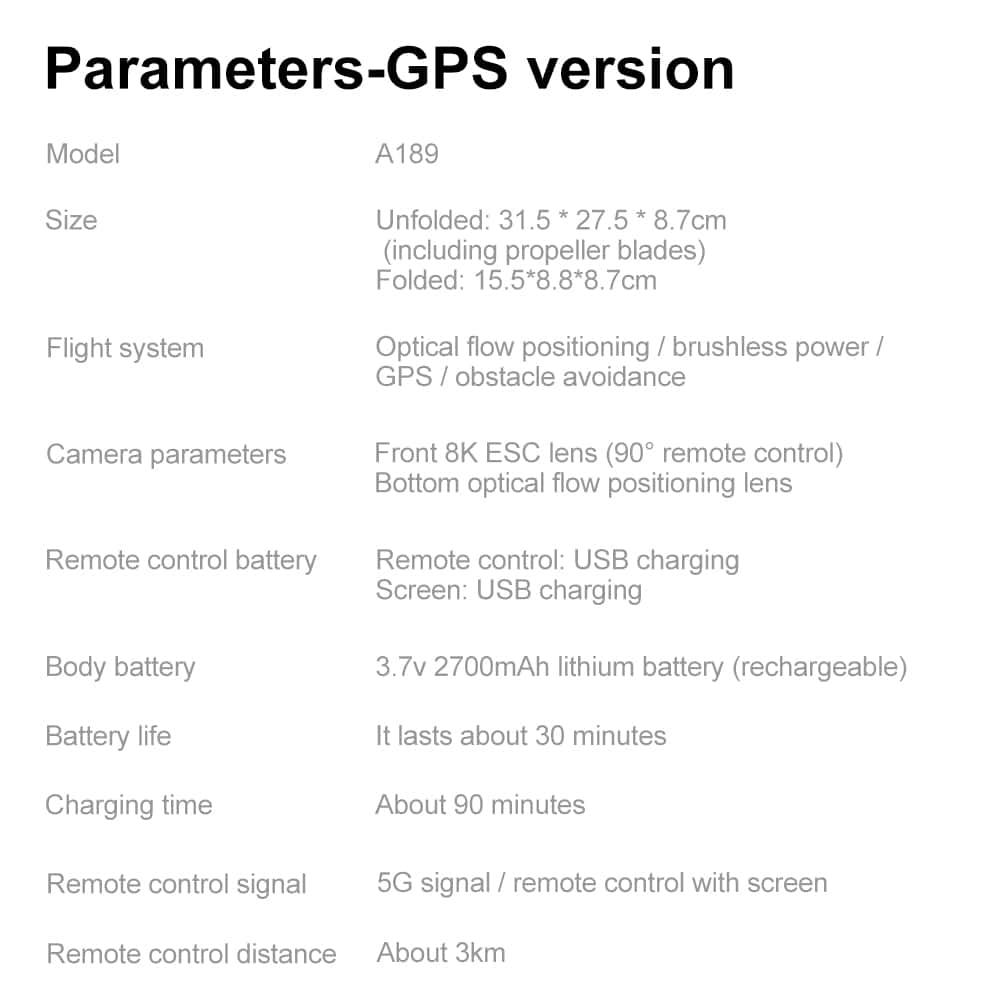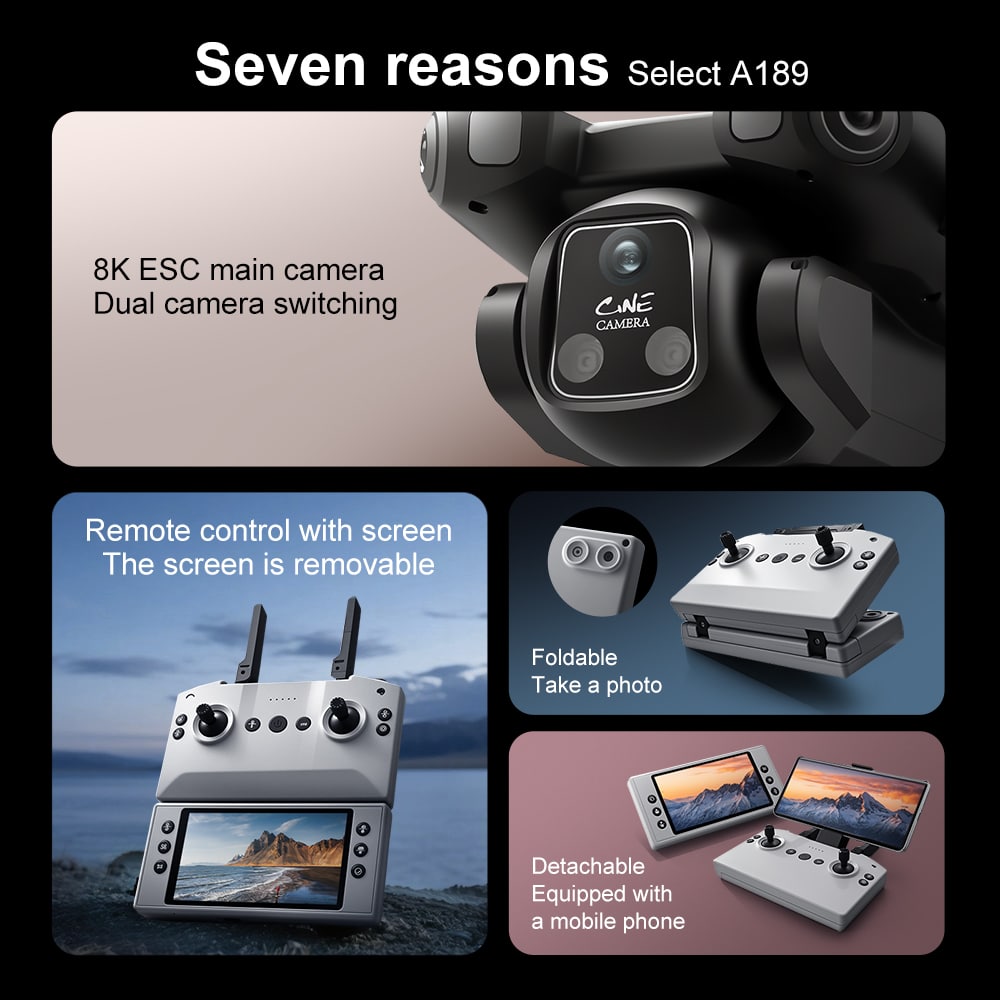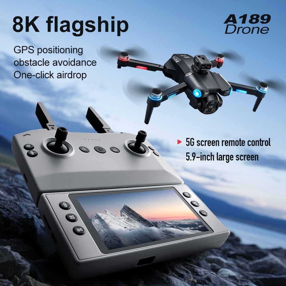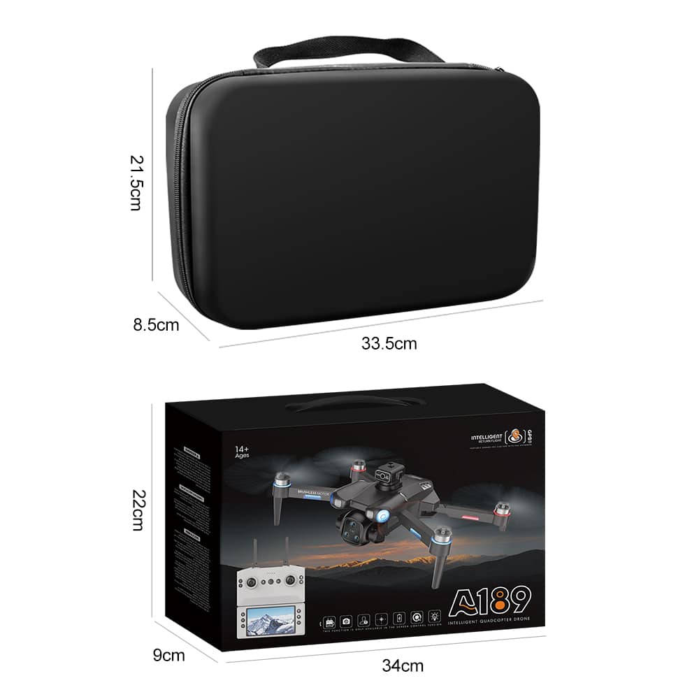 Drone A189 is a GPS drone featuring 5G transmission for smooth, lag-free video streaming. As a smart GPS drone, it offers real-time positioning that tracks both drone and phone locations with live flight data monitoring. The 5.9-inch remote controller screen on this GPS drone is foldable and detachable – it can also be used as a standalone camera. A189 includes a modular obstacle avoidance sensor head (optional installation). Low battery alert and multiple return-to-home functions (low battery auto return, signal loss auto return, one-key return) ensure flight safety. GPS modes include Follow Me, Orbit, and custom waypoint drawing.