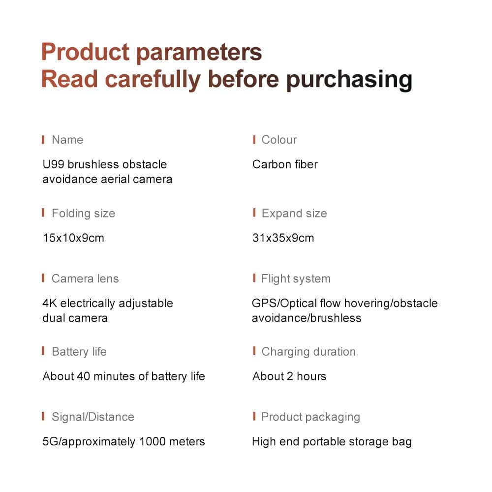 The U99 is constructed with lightweight carbon fiber for enhanced durability and flight performance. It features a 4.5-inch HD remote screen that displays stable, low-latency live footage via 5G real-time transmission. The drone utilizes integrated GPS and optical flow dual-mode positioning for accurate hovering and stable flight. Equipped with a high-definition 4K camera, it captures clear aerial imagery. Its intelligent safety system includes 360° laser obstacle avoidance and reliable auto-return functions, triggered by low battery, signal loss, or exceeding distance limits. Professional features such as follow and point-of-interest modes ensure versatile and secure operation.